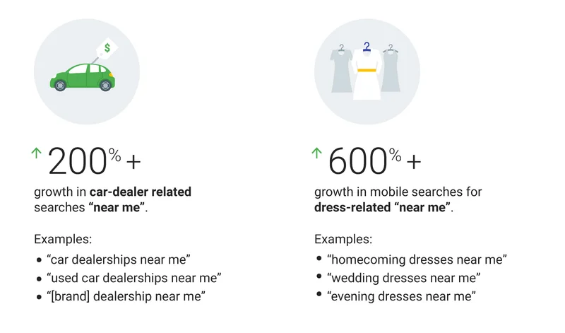 Even back in 2017, Think with Google reported over 200% growth in car-dealer “near me” searches and more than 600% growth in dress-related “near me” searches in just two years. That early data marked the start of a major shift in buyer behavior—one that continues to accelerate today.