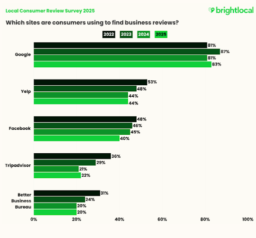 Recent data makes that impact clear. According to BrightLocal’s Local Consumer Review Survey 2025, 83% of consumers use Google to find business reviews—far more than any other platform. That makes Google Reviews not just a source of trust, but a key signal that can directly influence how you rank in local search results.